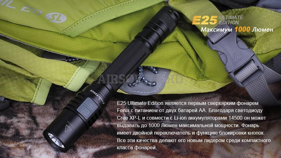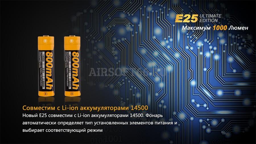 Инструкции по использованию: Аккумуляторный отсек фонаря Fenix E25UE вмещает два любых элемента питания размера АА. Это могут быть качественные щелочные батарейки, Ni-MH аккумуляторы или аналогичные по размеру Li-ion аккумуляторы с маркировкой 14500. Производители обращают внимание на то, что максимальная яркость фонаря в 1000 люмен возможна только если используются Li-ion аккумуляторы.