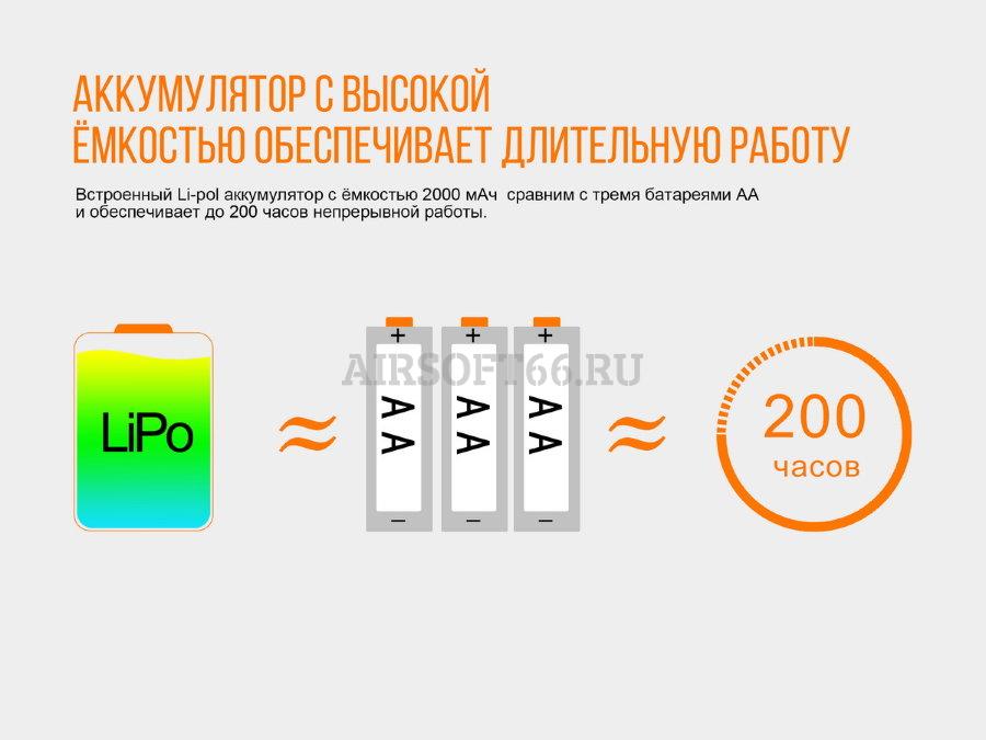 Low: режим освещения с яркостью 30 люмен и радиусом луча 16метров, энергии аккумулятора достаточно для работы в течение 60 часов;