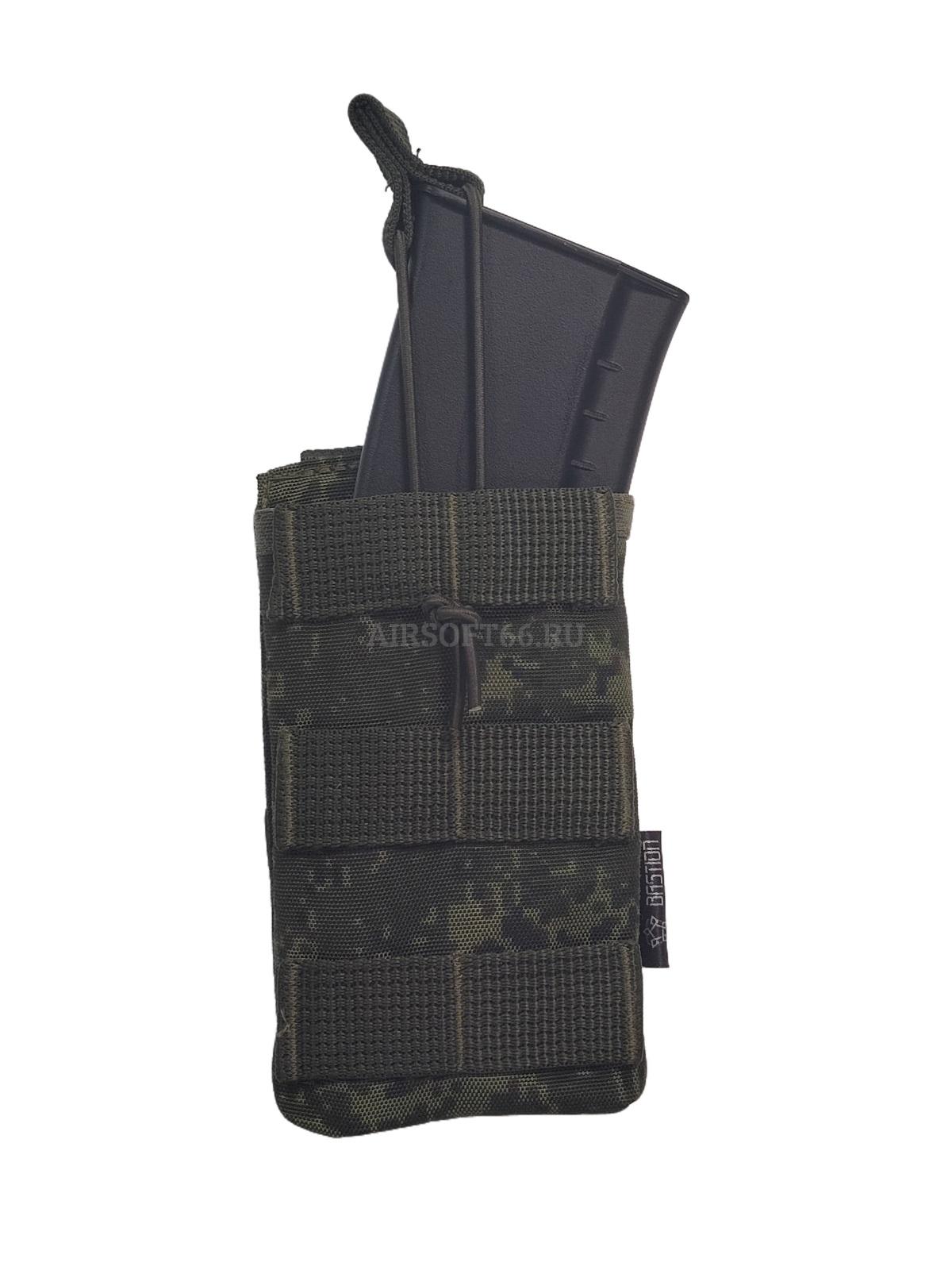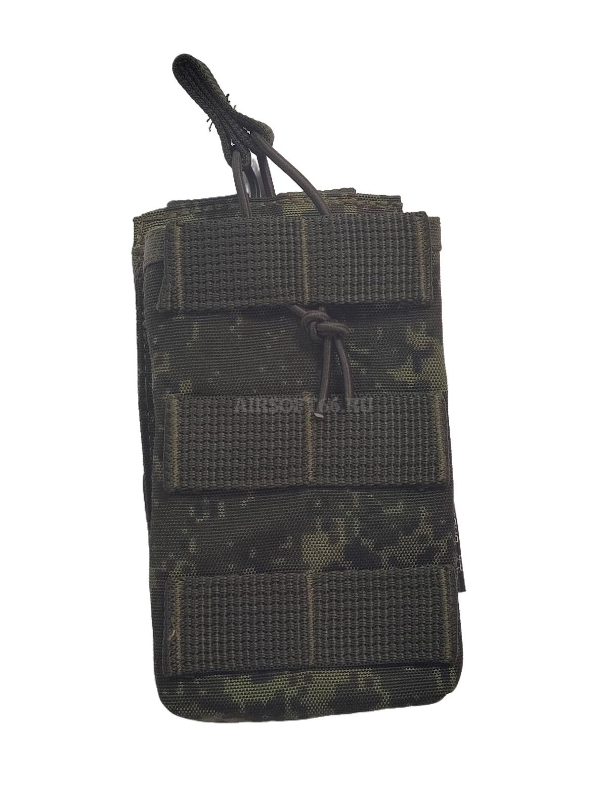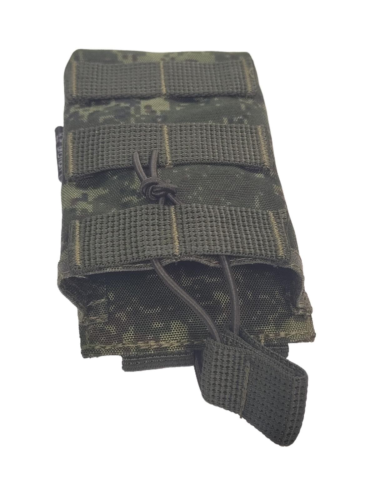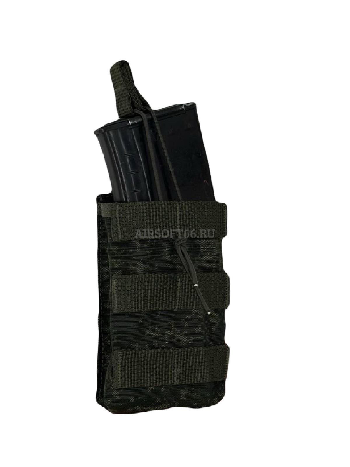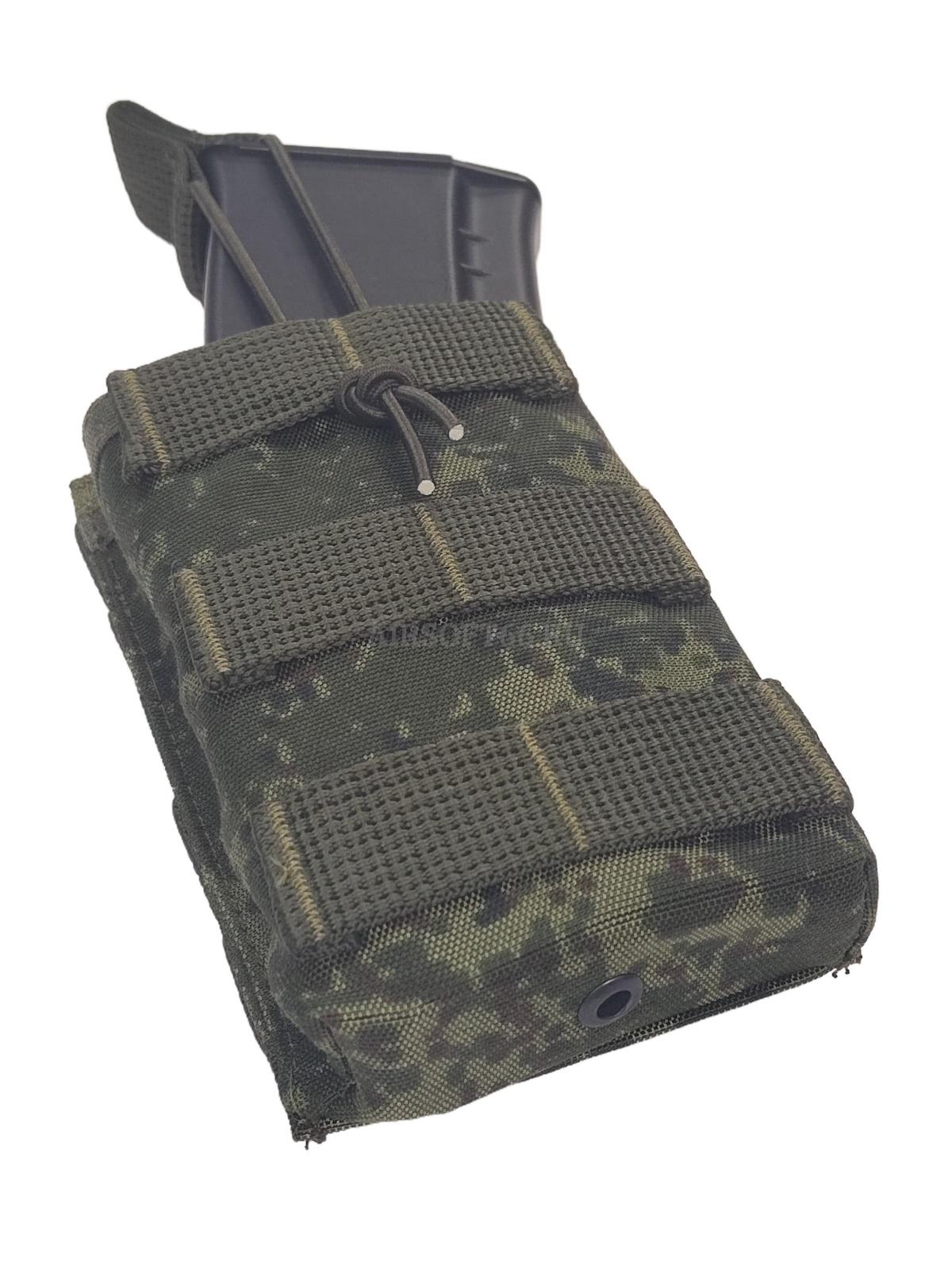 Подсумок предназначен для стандартных магазинов AR15/АК-серий, либо другого, схожего по габаритам. Запирается эластичным шнуром со стропой, что позволяет быстро извлекать магазин.