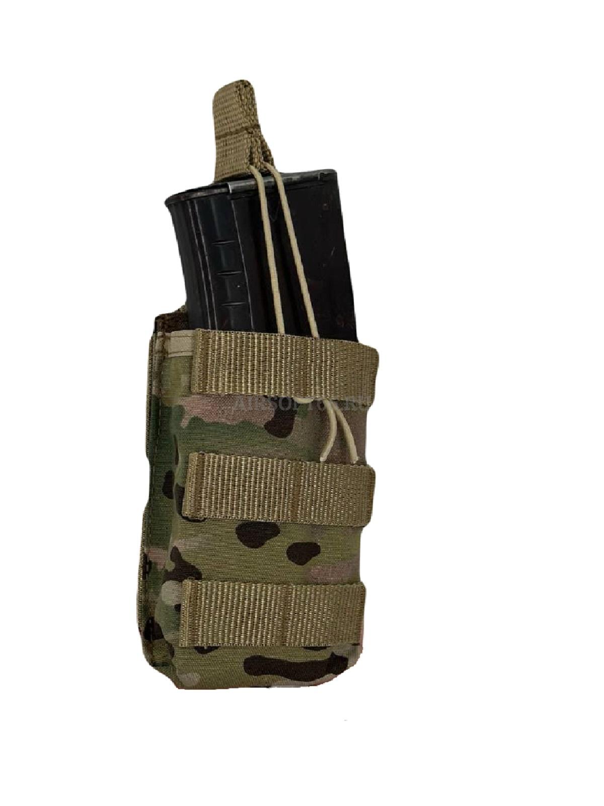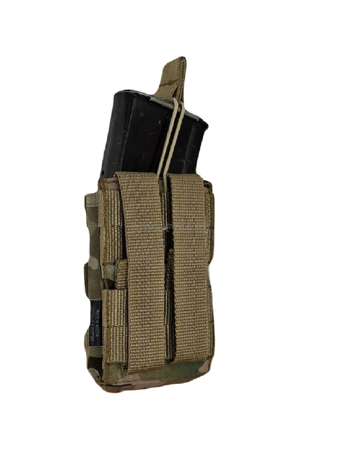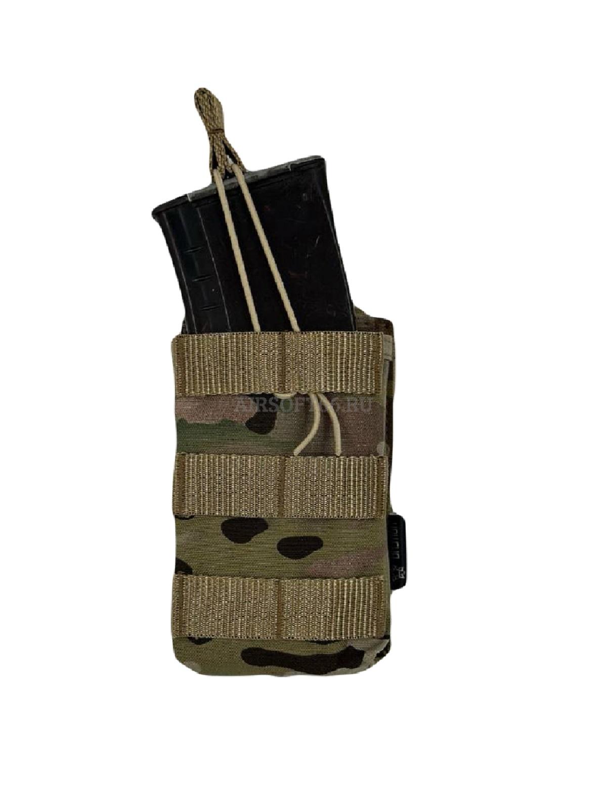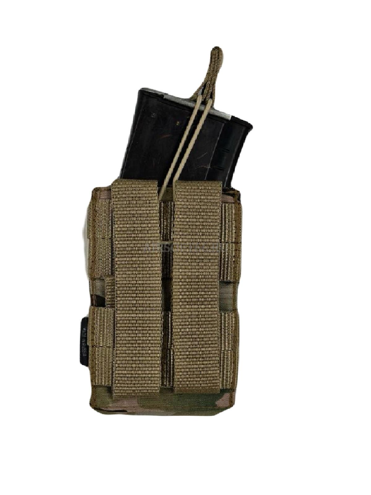 Подсумок предназначен для стандартных магазинов AR15/АК-серий, либо другого, схожего по габаритам. Запирается эластичным шнуром со стропой, что позволяет быстро извлекать магазин.