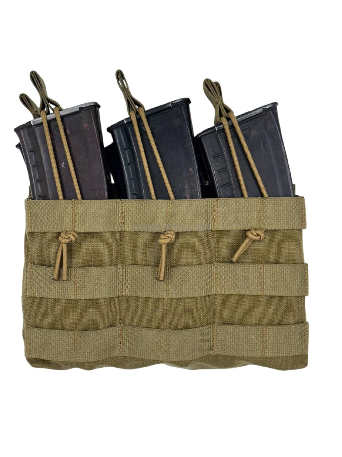 Подсумок предназначен для двух стандартных магазинов AR15/АК-серий, либо другого, схожего по габаритам. Запирается эластичным шнуром со стропой, что позволяет быстро извлекать магазин. Задняя стенка усилена пластиковой вставкой.