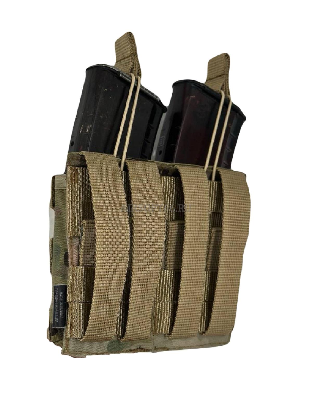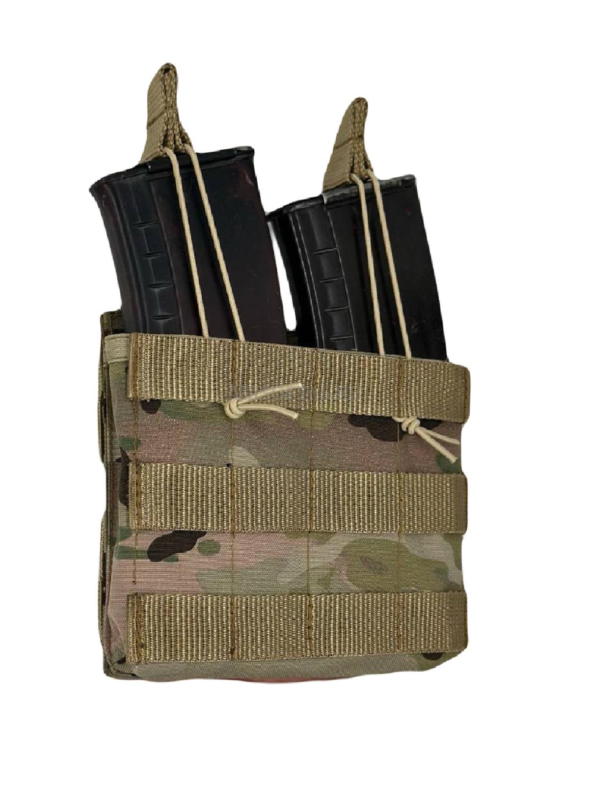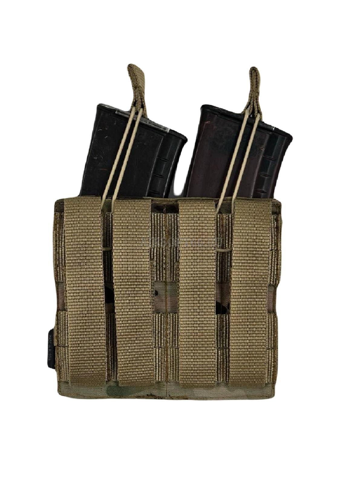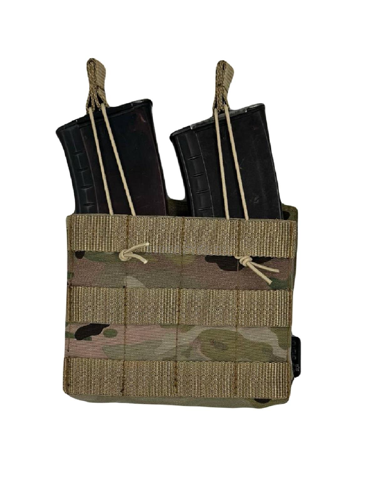 Подсумок предназначен для двух стандартных магазинов AR15/АК-серий, либо другого, схожего по габаритам. Запирается эластичным шнуром со стропой, что позволяет быстро извлекать магазин.