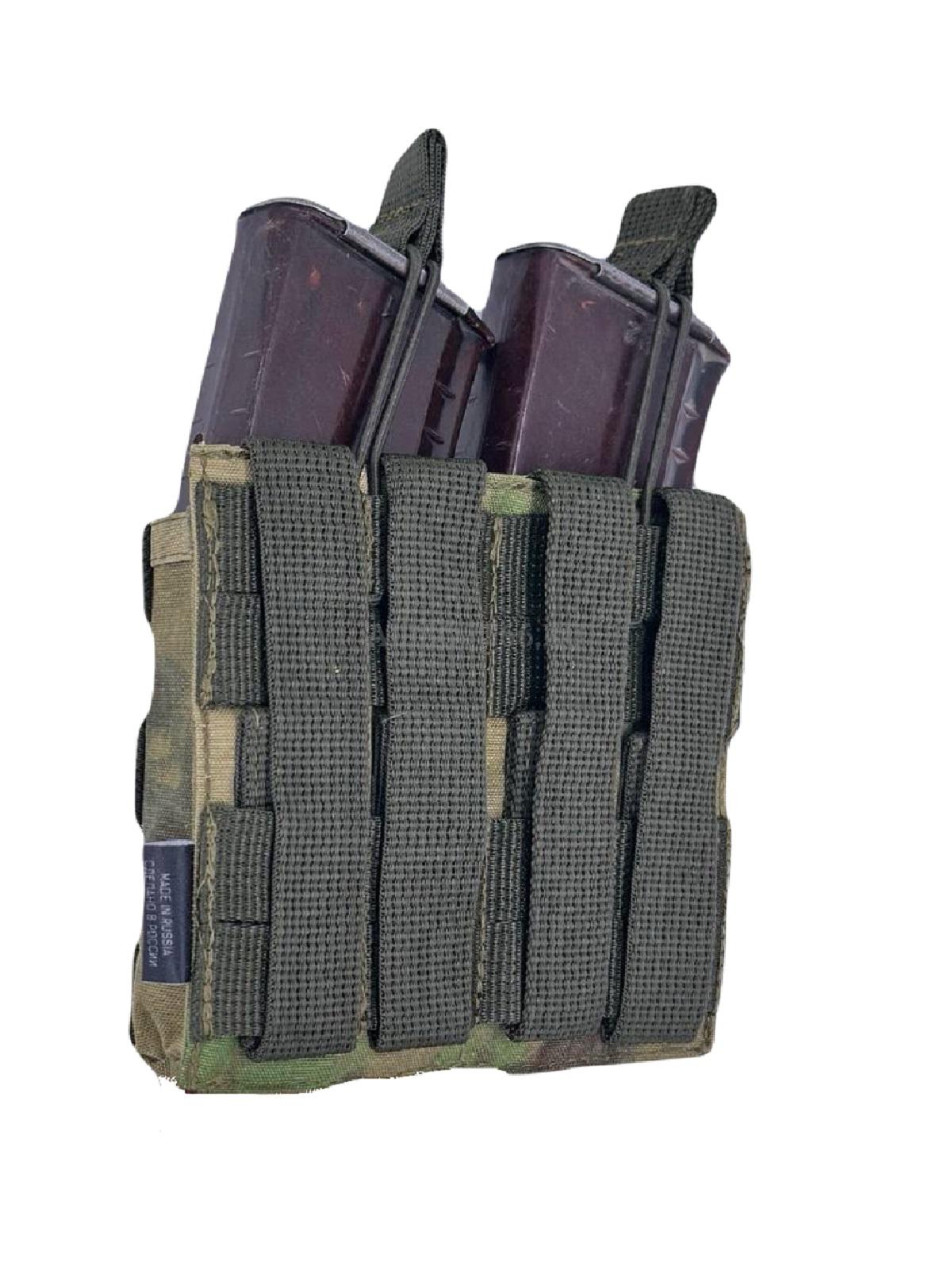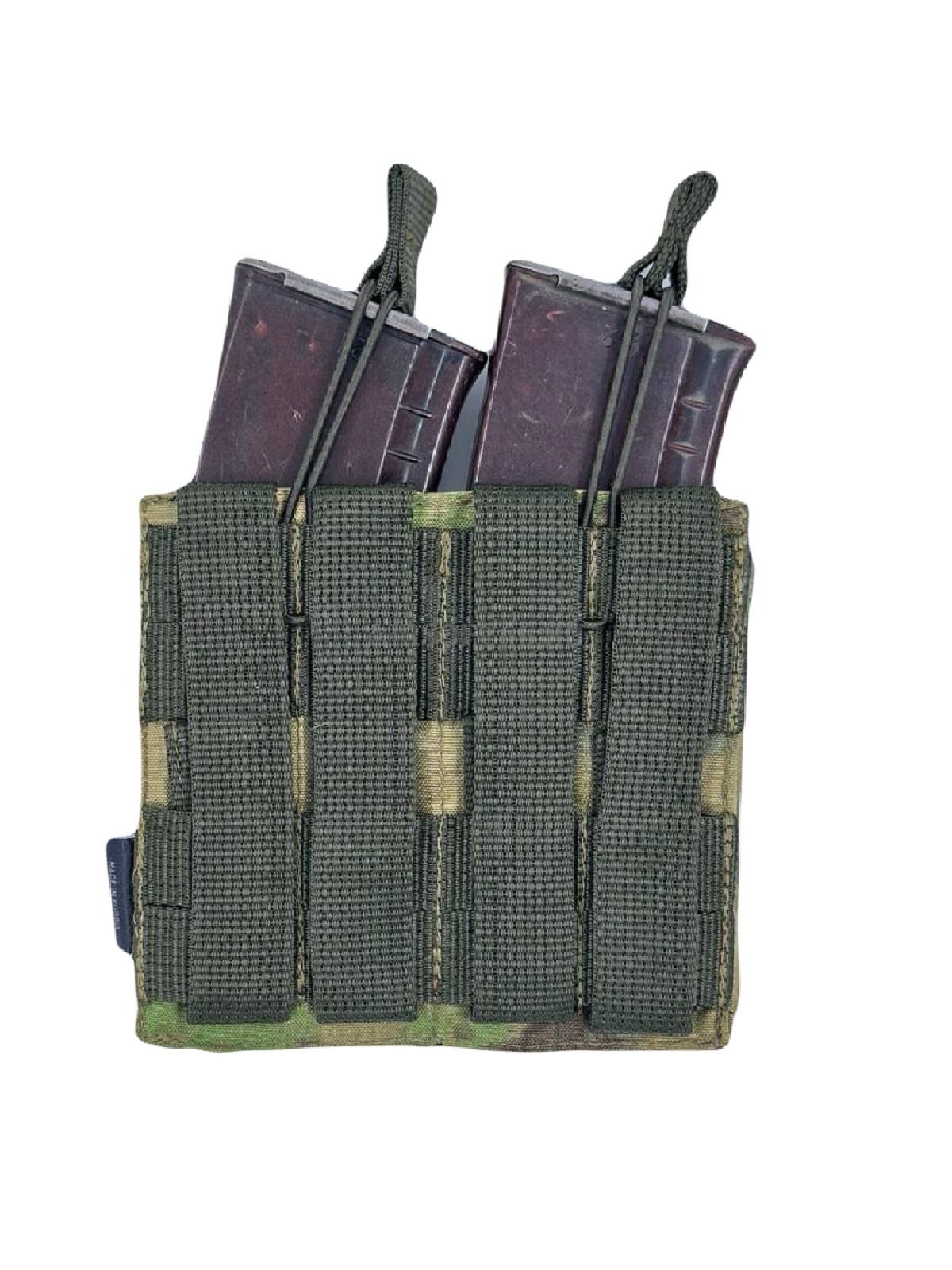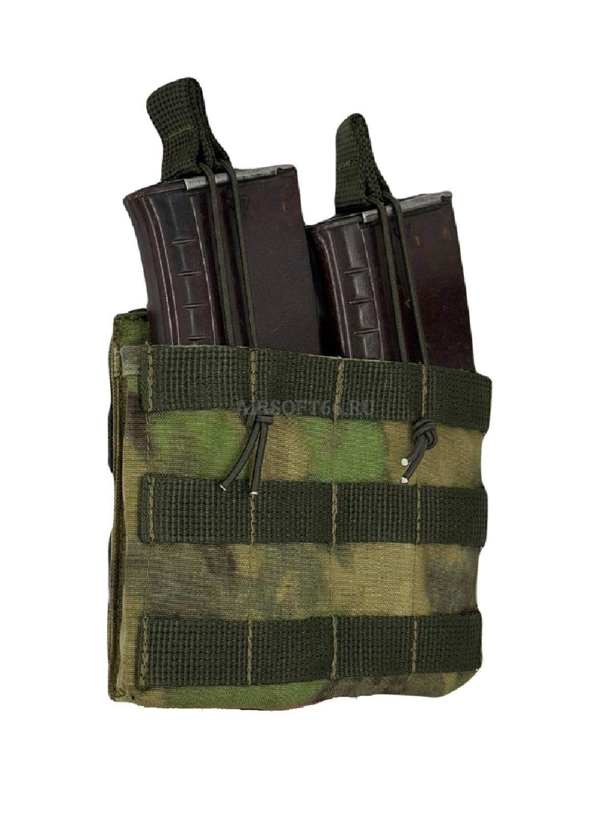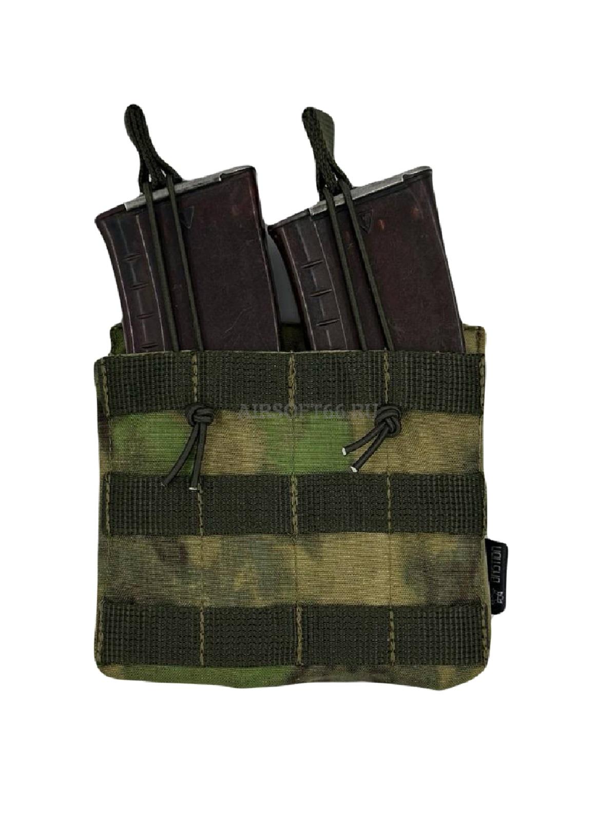 Подсумок предназначен для двух стандартных магазинов AR15/АК-серий, либо другого, схожего по габаритам. Запирается эластичным шнуром со стропой, что позволяет быстро извлекать магазин.
