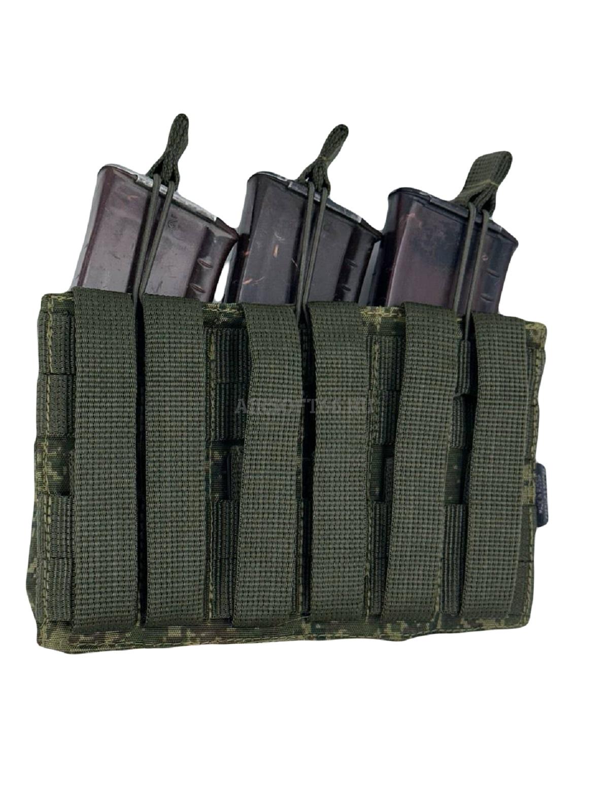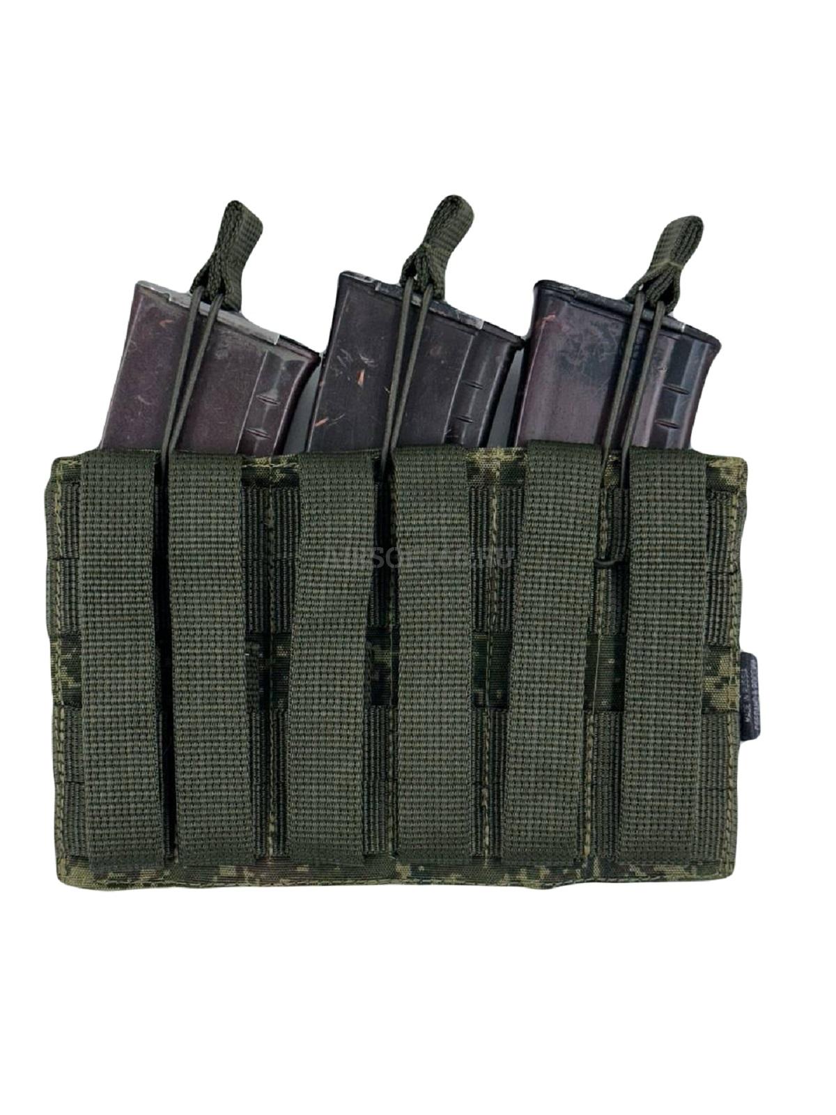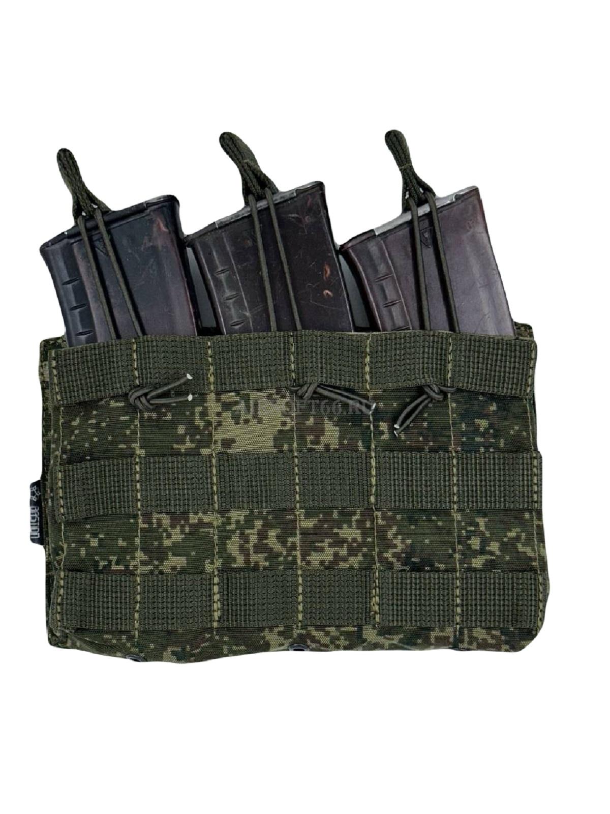 Подсумок предназначен для трех стандартных магазинов AR15/АК-серий, либо другого, схожего по габаритам. Запирается эластичным шнуром со стропой, что позволяет быстро извлекать магазин.
