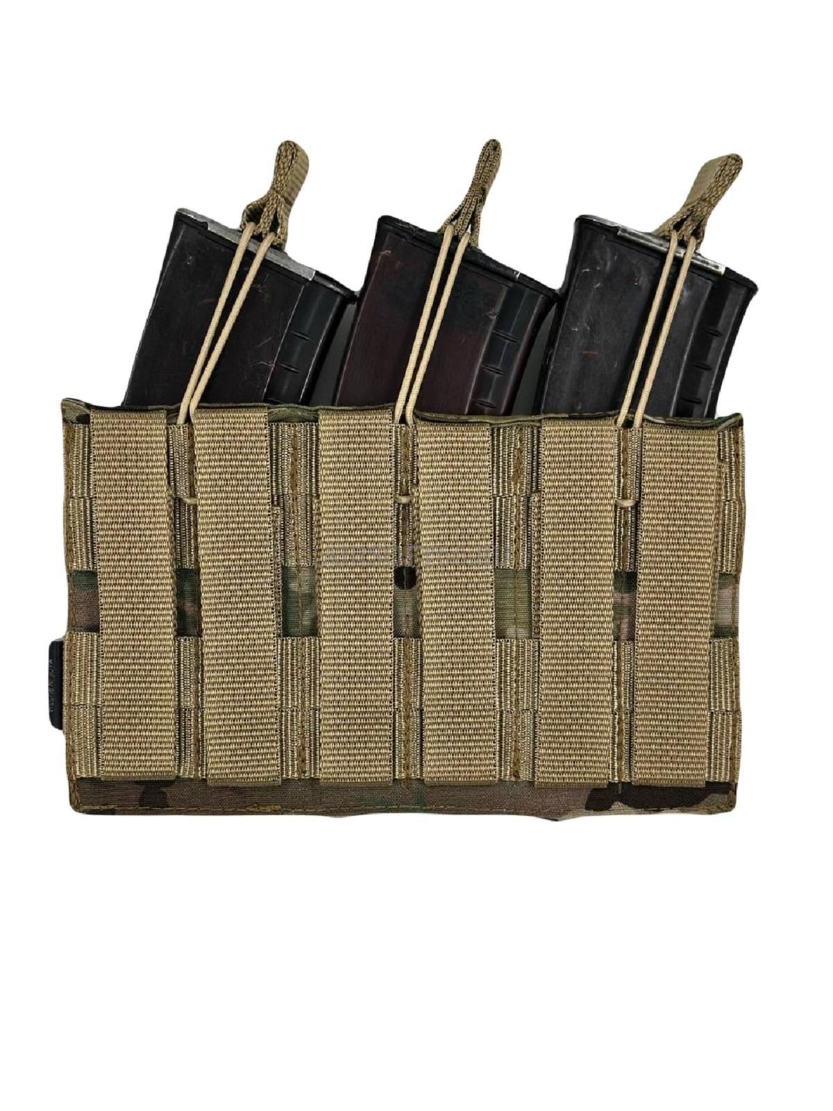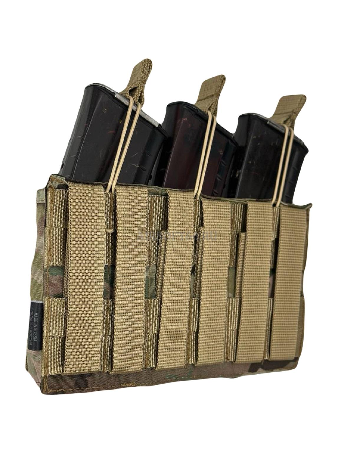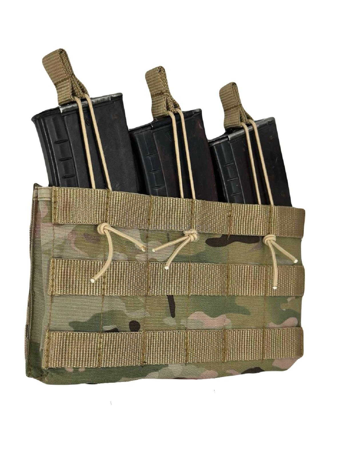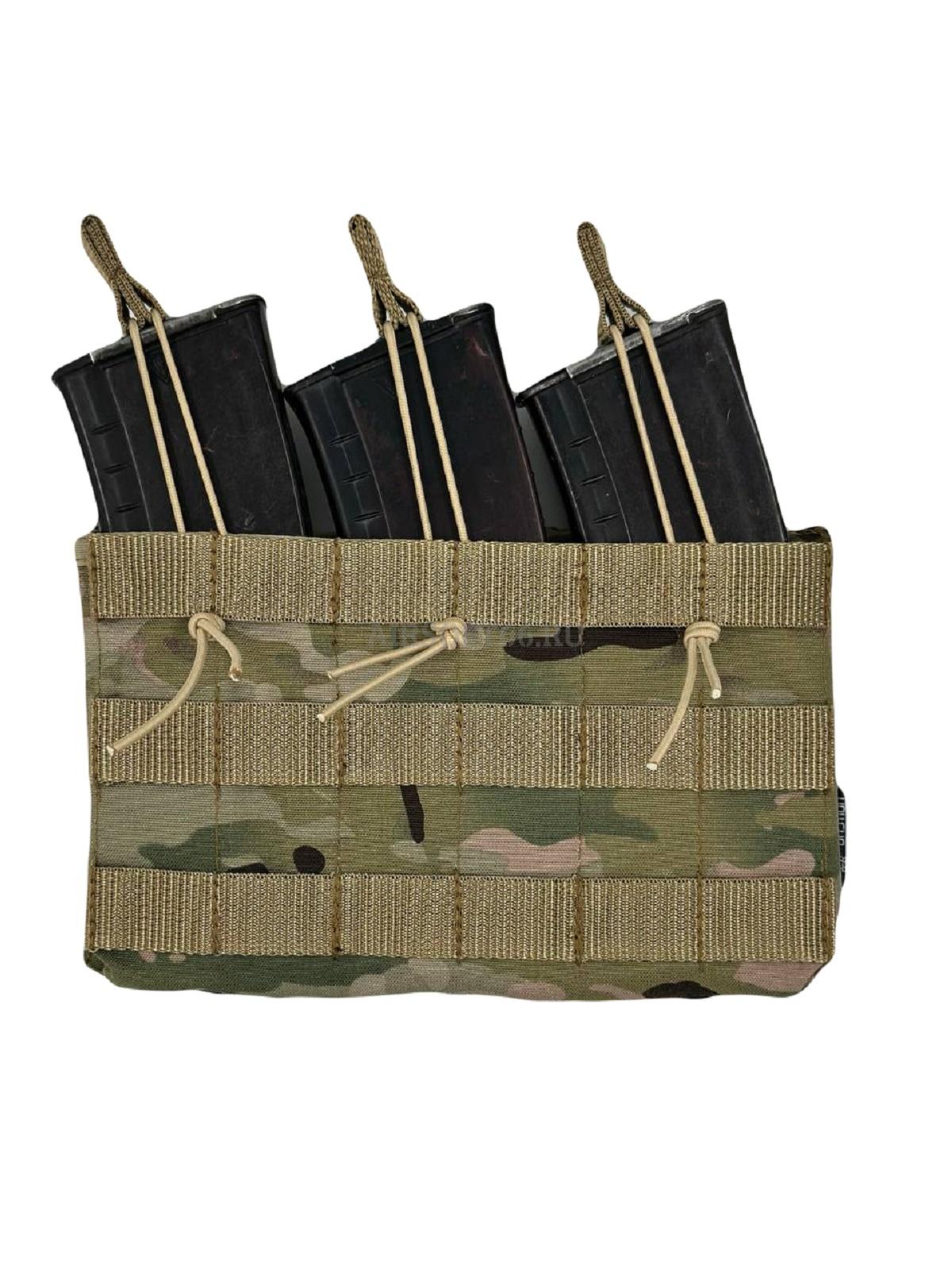 Подсумок предназначен для трех стандартных магазинов AR15/АК-серий, либо другого, схожего по габаритам. Запирается эластичным шнуром со стропой, что позволяет быстро извлекать магазин.